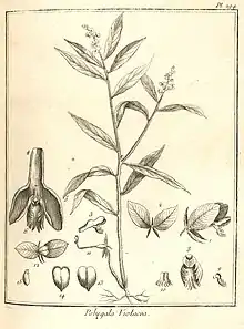 LE POLYGALA violet. (PLANCHE 294.)Cette plante pouſſe de ſa racine pluſieurs tiges grêles, velues, hautes d'environ un pied & demi ; elles ſont ſimples, quelquefois rameuſes, garnies de feuilles alternes, entières, étroites, pointues, longues de deux pouces, ſur quatre lignes de largeur. Elles ſont couvertes d'un léger duvet cendré.