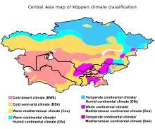Hu et le climatologue Zihang Han[10] distingue en 11 types de climat en Asie centrale (d'après la température de l'air et les précipitations mesurées de 1960 à 2020) ; depuis la fin des années 1980, le désert avance vers l'est et le nord (jusqu'à 100 kilomètres dans le nord de l'Ouzbékistan et du Kirghizistan, dans le sud du Kazakhstan et autour du bassin de Junggar, avec des effets secondaires en cascades sur les zones climatiques adjacentes qui s'assèchent aussi. Les températures moyennes annuelles ont gagné au moins 5 °C de 1990 à 2020 (par rapport à 1960-1979) dans plusieurs régions avec des étés plus secs et des précipitations plus concentrées sur l'hiver[11].