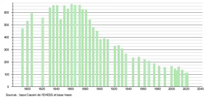 L'évolution du nombre d'habitants est connue à travers les recensements de la population effectués dans la commune depuis 1793. Pour les communes de moins de 10 000 habitants, une enquête de recensement portant sur toute la population est réalisée tous les cinq ans, les populations légales des années intermédiaires étant quant à elles estimées par interpolation ou extrapolation[16]. Pour la commune, le premier recensement exhaustif entrant dans le cadre du nouveau dispositif a été réalisé en 2004[17].