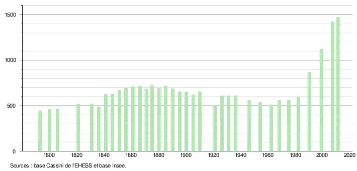 L'évolution du nombre d'habitants est connue à travers les recensements de la population effectués dans la commune depuis 1793. À partir du , les populations légales des communes sont publiées annuellement dans le cadre d'un recensement qui repose désormais sur une collecte d'information annuelle, concernant successivement tous les territoires communaux au cours d'une période de cinq ans. Pour les communes de moins de 10 000 habitants, une enquête de recensement portant sur toute la population est réalisée tous les cinq ans, les populations légales des années intermédiaires étant quant à elles estimées par interpolation ou extrapolation[20]. Pour la commune, le premier recensement exhaustif entrant dans le cadre du nouveau dispositif a été réalisé en 2007[21],[Note 1].