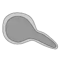 | En condition de stress[4], des organes de reproduction asexuée (ou conidiophores) se développent, à partir du mycélium. Ils sont formés d'une tige filamenteuse portant les cellules conidiogènes, produisant des spores (ou conidies). Les espèces du genre Aspergillus sont caractérisées par un conidiophore possédant une extrémité renflée (ou vésicule). Cette vésicule terminale est sphérique (de 40 µm de diamètre) et porte des cellules conidiogènes fertiles (ou phialides), en forme de bouteille[5]. Les phialides sont disposées sur tout le pourtour de la vésicule et sont portées par une cellule stérile (ou métule) directement insérée sur la vésicule. Les conidiophores sont lisses, hyalins ou brunâtres dans la partie supérieure, très longs (de 1 à 3 mm). La tête aspergillaire est globuleuse et radiée, noire à maturité. |