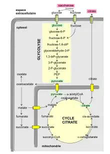 La voie métabolique qui conduit du saccharose à l'acide citrique (ou citrate) peut être schématisée dans une boîte noire décomposable en cinq éléments :
