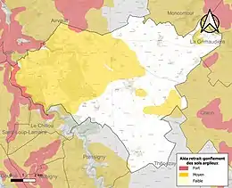Les mouvements de terrains susceptibles de se produire sur la commune sont des tassements différentiels[17]. Le retrait-gonflement des sols argileux est susceptible d'engendrer des dommages importants aux bâtiments en cas d’alternance de périodes de sécheresse et de pluie[18]. 45,8 % de la superficie communale est en aléa moyen ou fort (54,9 % au niveau départemental et 48,5 % au niveau national)[Carte 2]. Depuis le , en application de la loi ELAN, différentes contraintes s'imposent aux vendeurs, maîtres d'ouvrages ou constructeurs de biens situés dans une zone classée en aléa moyen ou fort[Note 2],[19].