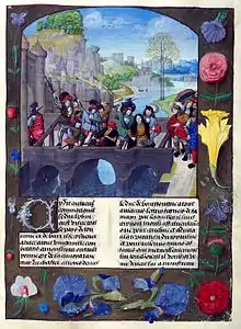 - Le Meurtre de Jean Sans Peur sur le pont de Monterau (Les chroniques d’Enguerrand de Monstrelet, XVe siècle, bibliothèque de l’Arsenal, Paris)