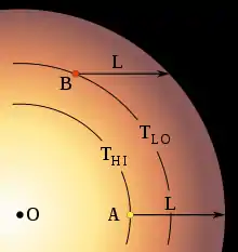 Cette couche est opaque au delà de L, quelque centaines de kilomètres. Lorsqu'on regarde le centre on voit la couche la plus basse (Point A), très chaude, qui rayonne beaucoup d’énergie lumineuse. mais lorsqu'on regarde la périphérie, la meme distance de penetration ne permet que de voir une couche plus élevée (point B), et donc moins chaude.