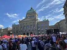 Le 18 septembre 2021, des manifestations sont organisées dans tout le pays par les organisations syndicales suisses. Les associations féministes et l'USS soulignent les inégalités actuelles du système de retraite, les femmes touchant 37 % en moyenne de moins que les hommes[21],[22],[23],[24]. La manifestation réunit 15 000 personnes à Berne[25],[26].