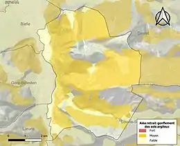 Le retrait-gonflement des sols argileux est susceptible d'engendrer des dommages importants aux bâtiments en cas d’alternance de périodes de sécheresse et de pluie[34]. 66,7 % de la superficie communale est en aléa moyen ou fort (59 % au niveau départemental et 48,5 % au niveau national)[Carte 2]. Depuis le , en application de la loi ELAN, différentes contraintes s'imposent aux vendeurs, maîtres d'ouvrages ou constructeurs de biens situés dans une zone classée en aléa moyen ou fort[Note 4],[35].