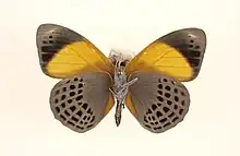 Le revers est gris beige avec aux ailes antérieures la même flaque orange que sur le dessus et aux ailes postérieures quatre lignes de points foncés parallèles à la marge.