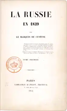 La Russie en 1839 se présente comme un recueil de 36 lettres écrites au cours de son voyage et que Custine a par la suite revues et considérablement développées pour publication en quatre volumes, en mai 1843, tout en y insérant des légendes et des récits de faits historiques. Il étoffe ses réflexions au moyen d'une dizaine d'ouvrages spécialisés sur la Russie[50]. Ce livre rencontre immédiatement un vif succès et est publié en Angleterre, au Danemark et en Allemagne, mais interdit en Russie. Quatre rééditions verront le jour en trois ans, sans compter plusieurs contrefaçons[51]. Avant la mort de Custine, il s'en serait vendu au moins 200 000 exemplaires[52].