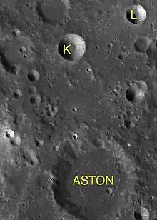 Aston est un cratère d'impact de 43 km de diamètre sur la face visible de la Lune. Le nom fut officiellement adopté par l'Union astronomique internationale (UAI) en 1964[4],[2],[3], en référence à Francis William Aston (1877 - 1945)[1],[2],[3].
