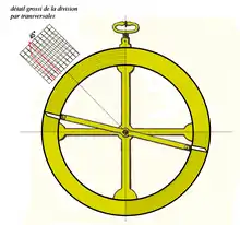 Sur la figure ci-contre, l'index (en rouge) indique une hauteur de 43,6°. Cette « méthode des transversales » est dite avoir été mise au point par Pedro Nunes (1502-1578)[N 15] ; elle sera mise en application sur certains instruments de Tycho Brahe et sur les instruments astronomiques à lunettes du XVIIe siècle, notamment sur ceux de Jean Picard, avant 1675.