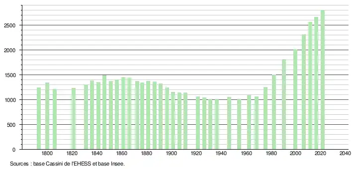 L'évolution du nombre d'habitants est connue à travers les recensements de la population effectués dans la commune depuis 1793. Pour les communes de moins de 10 000 habitants, une enquête de recensement portant sur toute la population est réalisée tous les cinq ans, les populations légales des années intermédiaires étant quant à elles estimées par interpolation ou extrapolation[32]. Pour la commune, le premier recensement exhaustif entrant dans le cadre du nouveau dispositif a été réalisé en 2006[33].