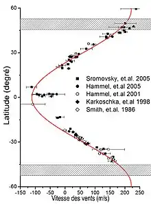 - (en) Cet article est partiellement ou en totalité issu de l’article de Wikipédia en anglais intitulé « Climate of Uranus » (voir la liste des auteurs).