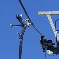 En gare, la barre de déport repose sur un rail de façon que l'axe de la douille reste parallèle à l'axe du câble. La douille possède un rayon légèrement plus large que le câble ; ainsi, ce dernier glisse librement à l'intérieur et la perche n'avance pas[8].