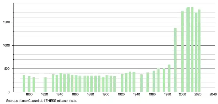 L'évolution du nombre d'habitants est connue à travers les recensements de la population effectués dans la commune depuis 1793. Pour les communes de moins de 10 000 habitants, une enquête de recensement portant sur toute la population est réalisée tous les cinq ans, les populations légales des années intermédiaires étant quant à elles estimées par interpolation ou extrapolation[24]. Pour la commune, le premier recensement exhaustif entrant dans le cadre du nouveau dispositif a été réalisé en 2007[25].