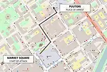 La police finlandaise indique dans un communiqué[13] avoir été alertée à 16 h 2, à 16 h 5, à Puutori, la police ordonne au suspect de s'immobiliser, celui-ci n'obéissant pas, les policiers lui tirent dans les cuisses[14],[15],[13].