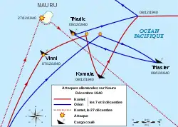Ils ont l'intention de débarquer sur Nauru et d'en bombarder les infrastructures le 8 décembre à l'aube mais le mauvais temps les en empêche. En revanche, la concentration de cargos bloqués par les intempéries et évoluant au large de l'île constitue une aubaine pour les Allemands[9]. Ils parviendront à les couler en conservant toujours leur effet de surprise. Le 7 décembre au soir, le Komet, parti en mission de reconnaissance, arraisonne puis coule le Vinni, un navire norvégien[10] de 5 181 tonnes[8] à environ quatorze kilomètres au sud de l'île, 32 marins sont faits prisonniers. L’Orion rejoint le Komet au large de Nauru aux premières heures du 8 décembre, il attaque et endommage le Triadic (6 378 tonnes), le capitaine du cargo tente de ramener son équipage sur l'île au moyen de canots de sauvetage mais ses hommes sont forcés de monter à bord du Kulmerland[9]. L'Orion coule ensuite le Triaster (6 032 tonnes). Le Komet tente alors sans succès de couler le Triadic avec des charges de sabordage. L’Orion parvient ensuite à l'envoyer par le fond en l'engageant au canon, avant que le Komet n'approche le Komata, un navire de 3 900 tonnes britannique. Celui-ci se rend compte des intentions hostiles du croiseur allemand avant qu'il n'attaque et tente d'envoyer un message de détresse. L'attaque du Komet, qui fait un mort et plusieurs blessés[8], détruit cependant l'émetteur radio, rendant cette tentative vaine ; l'équipage doit alors abandonner le navire[8]. Des charges sont posées dans le navire afin de le faire couler, mais ce n'est que dans l'après-midi qu'il est envoyé par le fond, de nouveau au canon[8].