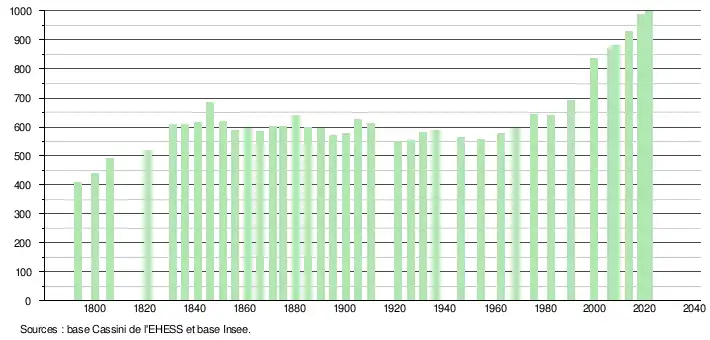 L'évolution du nombre d'habitants est connue à travers les recensements de la population effectués dans la commune depuis 1793. Pour les communes de moins de 10 000 habitants, une enquête de recensement portant sur toute la population est réalisée tous les cinq ans, les populations légales des années intermédiaires étant quant à elles estimées par interpolation ou extrapolation[17]. Pour la commune, le premier recensement exhaustif entrant dans le cadre du nouveau dispositif a été réalisé en 2008[18].