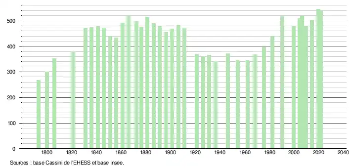 L'évolution du nombre d'habitants est connue à travers les recensements de la population effectués dans la commune depuis 1793. Pour les communes de moins de 10 000 habitants, une enquête de recensement portant sur toute la population est réalisée tous les cinq ans, les populations légales des années intermédiaires étant quant à elles estimées par interpolation ou extrapolation[23]. Pour la commune, le premier recensement exhaustif entrant dans le cadre du nouveau dispositif a été réalisé en 2004[24].