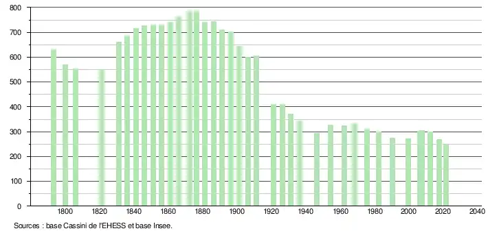 L'évolution du nombre d'habitants est connue à travers les recensements de la population effectués dans la commune depuis 1793. Pour les communes de moins de 10 000 habitants, une enquête de recensement portant sur toute la population est réalisée tous les cinq ans, les populations légales des années intermédiaires étant quant à elles estimées par interpolation ou extrapolation[22]. Pour la commune, le premier recensement exhaustif entrant dans le cadre du nouveau dispositif a été réalisé en 2007[23].
