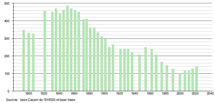 L'évolution du nombre d'habitants est connue à travers les recensements de la population effectués dans la commune depuis 1793. Pour les communes de moins de 10 000 habitants, une enquête de recensement portant sur toute la population est réalisée tous les cinq ans, les populations légales des années intermédiaires étant quant à elles estimées par interpolation ou extrapolation[19]. Pour la commune, le premier recensement exhaustif entrant dans le cadre du nouveau dispositif a été réalisé en 2006[20].