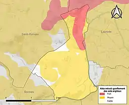 Le retrait-gonflement des sols argileux est susceptible d'engendrer des dommages importants aux bâtiments en cas d’alternance de périodes de sécheresse et de pluie. 93,4 % de la superficie communale est en aléa moyen ou fort (67,4 % au niveau départemental et 48,5 % au niveau national). Sur les 243 bâtiments dénombrés sur la commune en 2019, 243 sont en aléa moyen ou fort, soit 100 %, à comparer aux 81 % au niveau départemental et 54 % au niveau national. Une cartographie de l'exposition du territoire national au retrait gonflement des sols argileux est disponible sur le site du BRGM[26],[Carte 3].