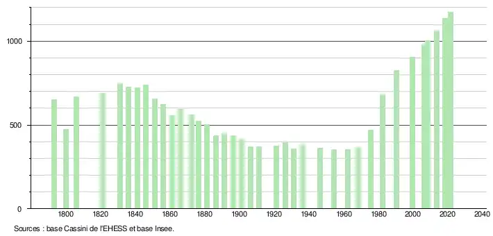 L'évolution du nombre d'habitants est connue à travers les recensements de la population effectués dans la commune depuis 1793. Pour les communes de moins de 10 000 habitants, une enquête de recensement portant sur toute la population est réalisée tous les cinq ans, les populations légales des années intermédiaires étant quant à elles estimées par interpolation ou extrapolation[27]. Pour la commune, le premier recensement exhaustif entrant dans le cadre du nouveau dispositif a été réalisé en 2008[28].