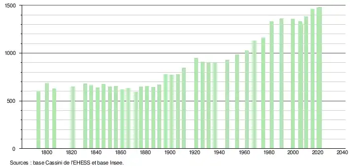 L'évolution du nombre d'habitants est connue à travers les recensements de la population effectués dans la commune depuis 1793. Pour les communes de moins de 10 000 habitants, une enquête de recensement portant sur toute la population est réalisée tous les cinq ans, les populations légales des années intermédiaires étant quant à elles estimées par interpolation ou extrapolation[29]. Pour la commune, le premier recensement exhaustif entrant dans le cadre du nouveau dispositif a été réalisé en 2005[30].