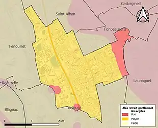Le retrait-gonflement des sols argileux est susceptible d'engendrer des dommages importants aux bâtiments en cas d’alternance de périodes de sécheresse et de pluie. La totalité de la commune est en aléa moyen ou fort (88,8 % au niveau départemental et 48,5 % au niveau national). Sur les 2 141 bâtiments dénombrés sur la commune en 2019, 2 141 sont en aléa moyen ou fort, soit 100 %, à comparer aux 98 % au niveau départemental et 54 % au niveau national. Une cartographie de l'exposition du territoire national au retrait gonflement des sols argileux est disponible sur le site du BRGM[25],[Carte 3].