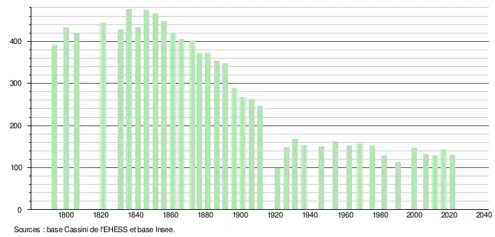 L'évolution du nombre d'habitants est connue à travers les recensements de la population effectués dans la commune depuis 1793. Pour les communes de moins de 10 000 habitants, une enquête de recensement portant sur toute la population est réalisée tous les cinq ans, les populations légales des années intermédiaires étant quant à elles estimées par interpolation ou extrapolation[28]. Pour la commune, le premier recensement exhaustif entrant dans le cadre du nouveau dispositif a été réalisé en 2006[29].