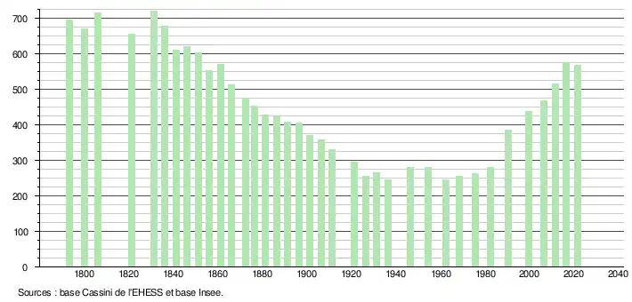 L'évolution du nombre d'habitants est connue à travers les recensements de la population effectués dans la commune depuis 1793. Pour les communes de moins de 10 000 habitants, une enquête de recensement portant sur toute la population est réalisée tous les cinq ans, les populations légales des années intermédiaires étant quant à elles estimées par interpolation ou extrapolation[32]. Pour la commune, le premier recensement exhaustif entrant dans le cadre du nouveau dispositif a été réalisé en 2006[33].