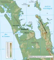 La ville d'Auckland elle-même recouvre la plus grande partie de l'isthme du même nom. En face, de l'autre côté de la Waitemata, on trouve North Shore City ; à l'ouest, dans les contreforts de la chaîne des monts Waitakere, la ville de Waitakere, et au sud on trouve la ville de Manukau, près de la côte est de la baie du même nom. On y trouve l'aéroport international d'Auckland.