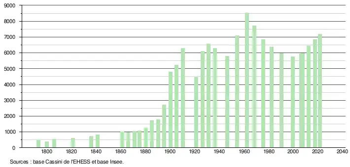 - Population municipale légale en vigueur au 1er janvier 2024, millésimée 2021, définie dans les limites territoriales en vigueur au 1er janvier 2023, date de référence statistique : 1er janvier 2021.