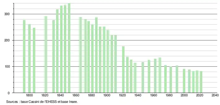 L'évolution du nombre d'habitants est connue à travers les recensements de la population effectués dans la commune depuis 1793. Pour les communes de moins de 10 000 habitants, une enquête de recensement portant sur toute la population est réalisée tous les cinq ans, les populations légales des années intermédiaires étant quant à elles estimées par interpolation ou extrapolation[17]. Pour la commune, le premier recensement exhaustif entrant dans le cadre du nouveau dispositif a été réalisé en 2006[18].