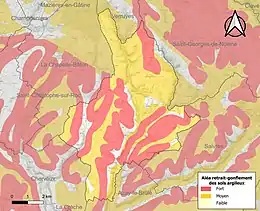 Les mouvements de terrains susceptibles de se produire sur la commune sont des tassements différentiels[17]. Le retrait-gonflement des sols argileux est susceptible d'engendrer des dommages importants aux bâtiments en cas d’alternance de périodes de sécheresse et de pluie[18]. 90,7 % de la superficie communale est en aléa moyen ou fort (54,9 % au niveau départemental et 48,5 % au niveau national)[Carte 2]. Depuis le , en application de la loi ELAN, différentes contraintes s'imposent aux vendeurs, maîtres d'ouvrages ou constructeurs de biens situés dans une zone classée en aléa moyen ou fort[Note 3],[19].
