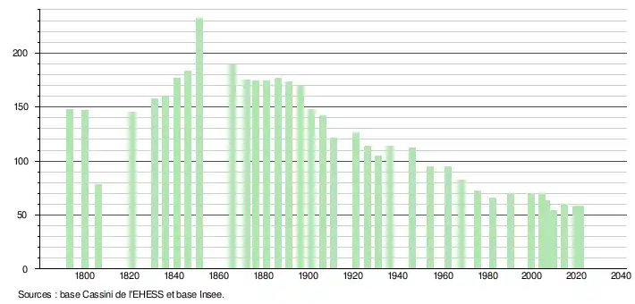 L'évolution du nombre d'habitants est connue à travers les recensements de la population effectués dans la commune depuis 1793. Pour les communes de moins de 10 000 habitants, une enquête de recensement portant sur toute la population est réalisée tous les cinq ans, les populations légales des années intermédiaires étant quant à elles estimées par interpolation ou extrapolation[18]. Pour la commune, le premier recensement exhaustif entrant dans le cadre du nouveau dispositif a été réalisé en 2004[19].