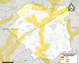 Le retrait-gonflement des sols argileux est susceptible d'engendrer des dommages importants aux bâtiments en cas d’alternance de périodes de sécheresse et de pluie. 26,1 % de la superficie communale est en aléa moyen ou fort (33,6 % au niveau départemental et 48,5 % au niveau national). Sur les 88 bâtiments dénombrés sur la commune en 2019, 27 sont en aléa moyen ou fort, soit 31 %, à comparer aux 25 % au niveau départemental et 54 % au niveau national. Une cartographie de l'exposition du territoire national au retrait gonflement des sols argileux est disponible sur le site du BRGM[16],[Carte 2].