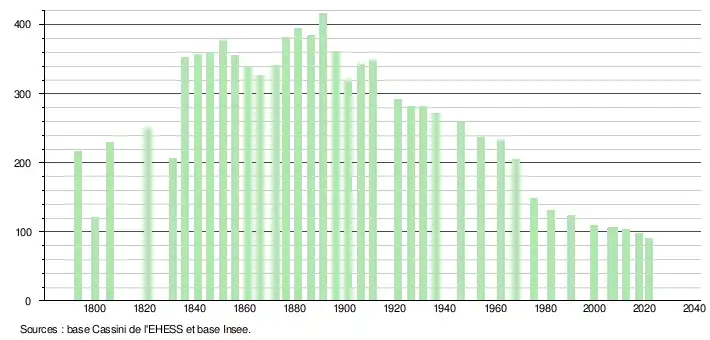 L'évolution du nombre d'habitants est connue à travers les recensements de la population effectués dans la commune depuis 1793. Pour les communes de moins de 10 000 habitants, une enquête de recensement portant sur toute la population est réalisée tous les cinq ans, les populations légales des années intermédiaires étant quant à elles estimées par interpolation ou extrapolation[20]. Pour la commune, le premier recensement exhaustif entrant dans le cadre du nouveau dispositif a été réalisé en 2007[21].