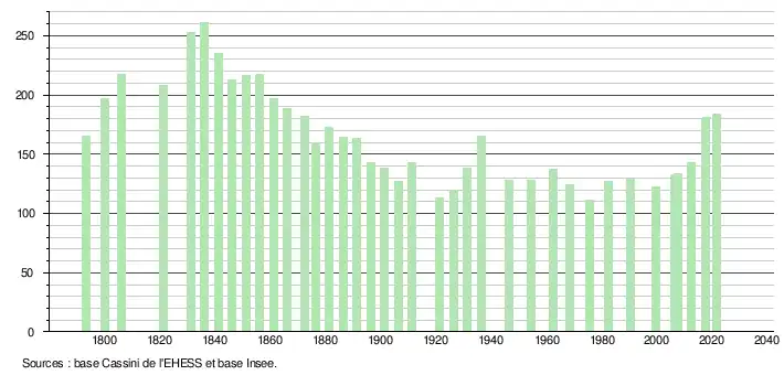 L'évolution du nombre d'habitants est connue à travers les recensements de la population effectués dans la commune depuis 1793. Pour les communes de moins de 10 000 habitants, une enquête de recensement portant sur toute la population est réalisée tous les cinq ans, les populations légales des années intermédiaires étant quant à elles estimées par interpolation ou extrapolation[24]. Pour la commune, le premier recensement exhaustif entrant dans le cadre du nouveau dispositif a été réalisé en 2007[25].