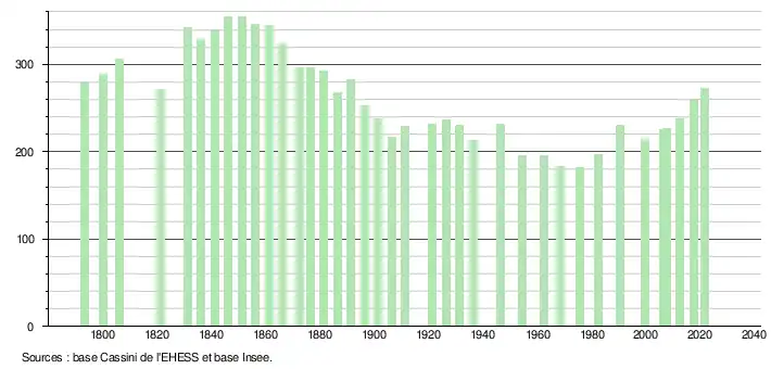 L'évolution du nombre d'habitants est connue à travers les recensements de la population effectués dans la commune depuis 1793. Pour les communes de moins de 10 000 habitants, une enquête de recensement portant sur toute la population est réalisée tous les cinq ans, les populations légales des années intermédiaires étant quant à elles estimées par interpolation ou extrapolation[26]. Pour la commune, le premier recensement exhaustif entrant dans le cadre du nouveau dispositif a été réalisé en 2007[27].