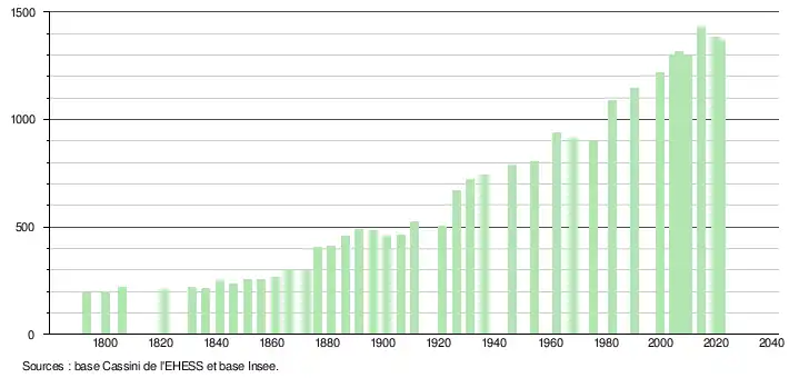 L'évolution du nombre d'habitants est connue à travers les recensements de la population effectués dans la commune depuis 1793. Pour les communes de moins de 10 000 habitants, une enquête de recensement portant sur toute la population est réalisée tous les cinq ans, les populations légales des années intermédiaires étant quant à elles estimées par interpolation ou extrapolation[26]. Pour la commune, le premier recensement exhaustif entrant dans le cadre du nouveau dispositif a été réalisé en 2004[27].