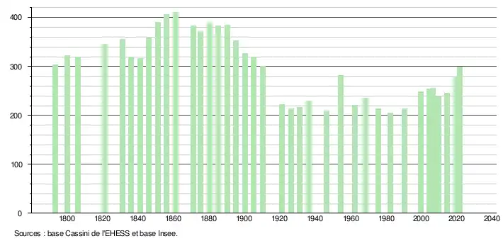 L'évolution du nombre d'habitants est connue à travers les recensements de la population effectués dans la commune depuis 1793. Pour les communes de moins de 10 000 habitants, une enquête de recensement portant sur toute la population est réalisée tous les cinq ans, les populations légales des années intermédiaires étant quant à elles estimées par interpolation ou extrapolation[18]. Pour la commune, le premier recensement exhaustif entrant dans le cadre du nouveau dispositif a été réalisé en 2004[19].