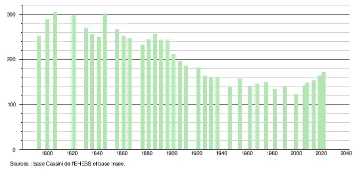 L'évolution du nombre d'habitants est connue à travers les recensements de la population effectués dans la commune depuis 1793. Pour les communes de moins de 10 000 habitants, une enquête de recensement portant sur toute la population est réalisée tous les cinq ans, les populations légales des années intermédiaires étant quant à elles estimées par interpolation ou extrapolation[18]. Pour la commune, le premier recensement exhaustif entrant dans le cadre du nouveau dispositif a été réalisé en 2008[19].