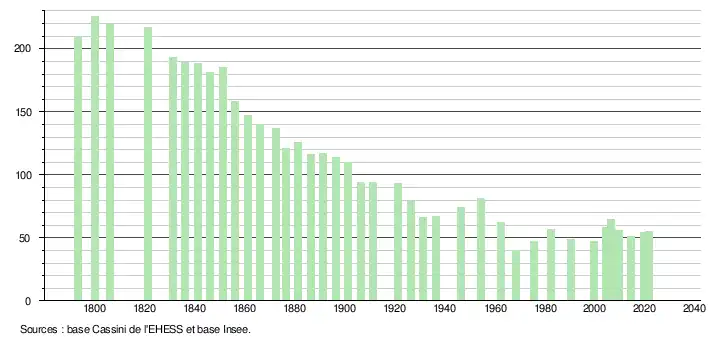 L'évolution du nombre d'habitants est connue à travers les recensements de la population effectués dans la commune depuis 1793. Pour les communes de moins de 10 000 habitants, une enquête de recensement portant sur toute la population est réalisée tous les cinq ans, les populations légales des années intermédiaires étant quant à elles estimées par interpolation ou extrapolation[17]. Pour la commune, le premier recensement exhaustif entrant dans le cadre du nouveau dispositif a été réalisé en 2004[18].