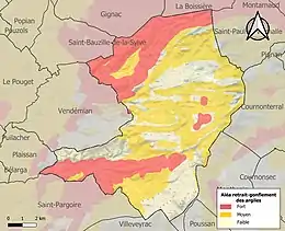 Le retrait-gonflement des sols argileux est susceptible d'engendrer des dommages importants aux bâtiments en cas d’alternance de périodes de sécheresse et de pluie. 71,3 % de la superficie communale est en aléa moyen ou fort (59,3 % au niveau départemental et 48,5 % au niveau national). Sur les 236 bâtiments dénombrés sur la commune en 2019, 232 sont en aléa moyen ou fort, soit 98 %, à comparer aux 85 % au niveau départemental et 54 % au niveau national. Une cartographie de l'exposition du territoire national au retrait gonflement des sols argileux est disponible sur le site du BRGM[21],[Carte 2].