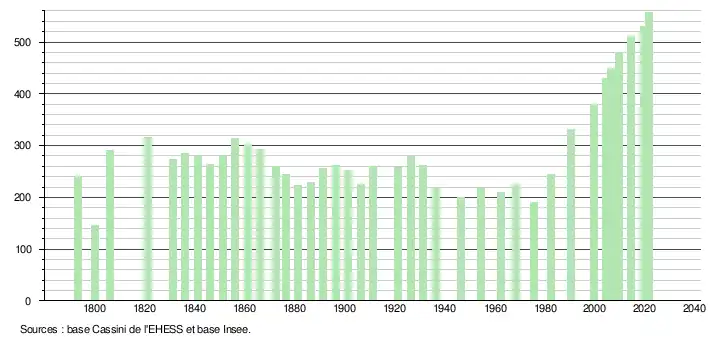 L'évolution du nombre d'habitants est connue à travers les recensements de la population effectués dans la commune depuis 1793. Pour les communes de moins de 10 000 habitants, une enquête de recensement portant sur toute la population est réalisée tous les cinq ans, les populations légales des années intermédiaires étant quant à elles estimées par interpolation ou extrapolation[33]. Pour la commune, le premier recensement exhaustif entrant dans le cadre du nouveau dispositif a été réalisé en 2004[34].