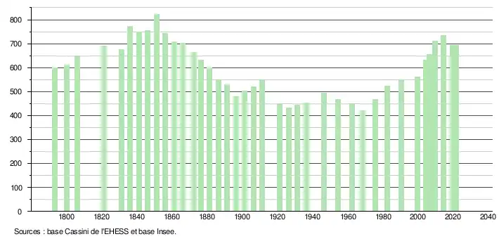 L'évolution du nombre d'habitants est connue à travers les recensements de la population effectués dans la commune depuis 1793. Pour les communes de moins de 10 000 habitants, une enquête de recensement portant sur toute la population est réalisée tous les cinq ans, les populations légales des années intermédiaires étant quant à elles estimées par interpolation ou extrapolation[24]. Pour la commune, le premier recensement exhaustif entrant dans le cadre du nouveau dispositif a été réalisé en 2004[25].