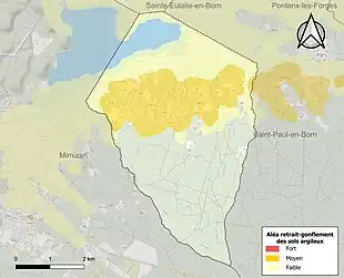 Le retrait-gonflement des sols argileux est susceptible d'engendrer des dommages importants aux bâtiments en cas d’alternance de périodes de sécheresse et de pluie. 25,8 % de la superficie communale est en aléa moyen ou fort (19,2 % au niveau départemental et 48,5 % au niveau national). Sur les 700 bâtiments dénombrés sur la commune en 2019, 626 sont en aléa moyen ou fort, soit 89 %, à comparer aux 17 % au niveau départemental et 54 % au niveau national. Une cartographie de l'exposition du territoire national au retrait gonflement des sols argileux est disponible sur le site du BRGM[20],[Carte 2].