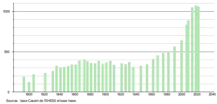 L'évolution du nombre d'habitants est connue à travers les recensements de la population effectués dans la commune depuis 1793. Pour les communes de moins de 10 000 habitants, une enquête de recensement portant sur toute la population est réalisée tous les cinq ans, les populations légales des années intermédiaires étant quant à elles estimées par interpolation ou extrapolation[22]. Pour la commune, le premier recensement exhaustif entrant dans le cadre du nouveau dispositif a été réalisé en 2008[23].
