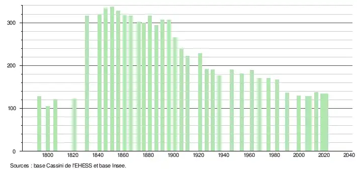 L'évolution du nombre d'habitants est connue à travers les recensements de la population effectués dans la commune depuis 1793. Pour les communes de moins de 10 000 habitants, une enquête de recensement portant sur toute la population est réalisée tous les cinq ans, les populations légales des années intermédiaires étant quant à elles estimées par interpolation ou extrapolation[26]. Pour la commune, le premier recensement exhaustif entrant dans le cadre du nouveau dispositif a été réalisé en 2008[27].